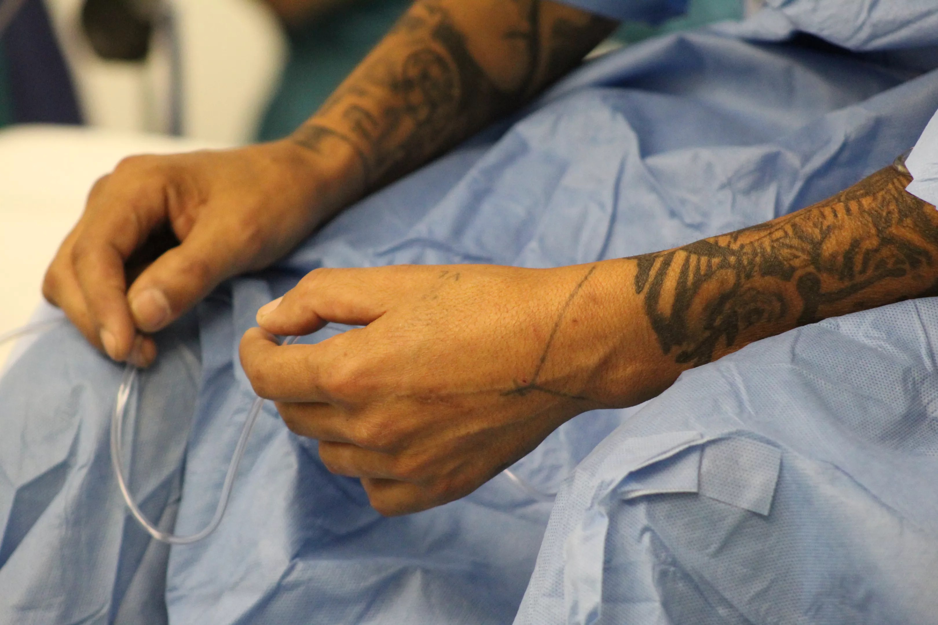 From his hands to his neck, nearly every square inch of Hernández’s skinny frame is tattooed. He bows his head and doesn’t say a word as doctors administer spinal anesthesia. The beveled tip of the hypodermic needle pierces the image of a devilish goat on his back.
