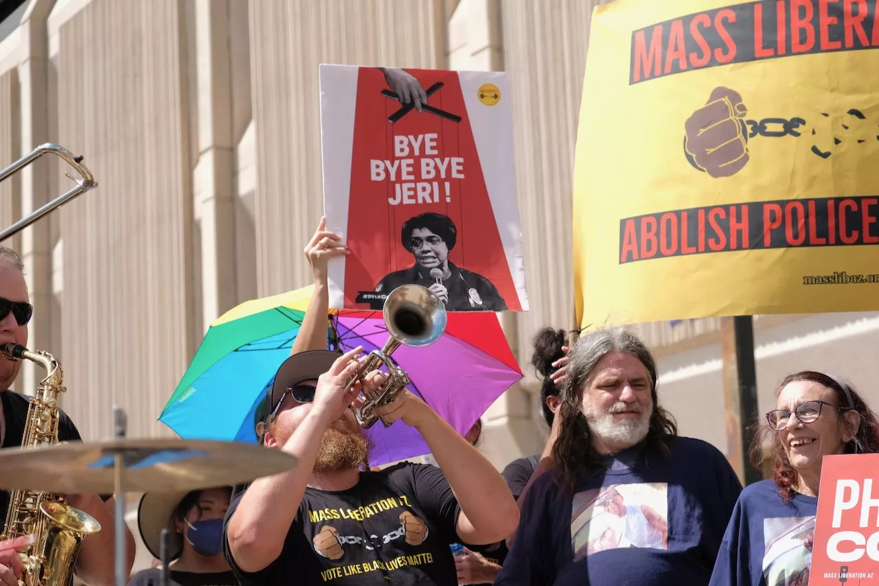 Activists with Mass Liberation Arizona rallied outside Phoenix police headquarters on Monday to celebrate the departure of former Chief Jeri Williams.