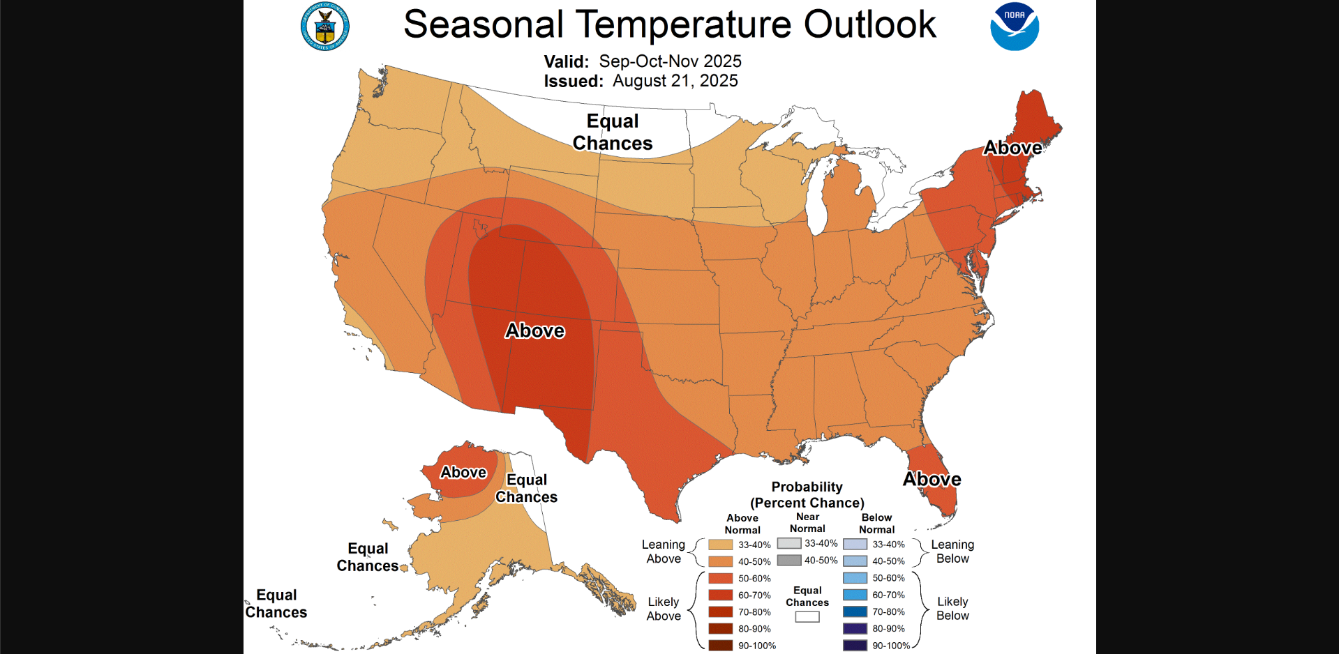 The NWS’s Climate Prediction Center projects above-average temperatures and below-average rainfall across the Valley for September, October and November. The northeastern corner of the state has even stronger chances of higher-than-normal temperatures.