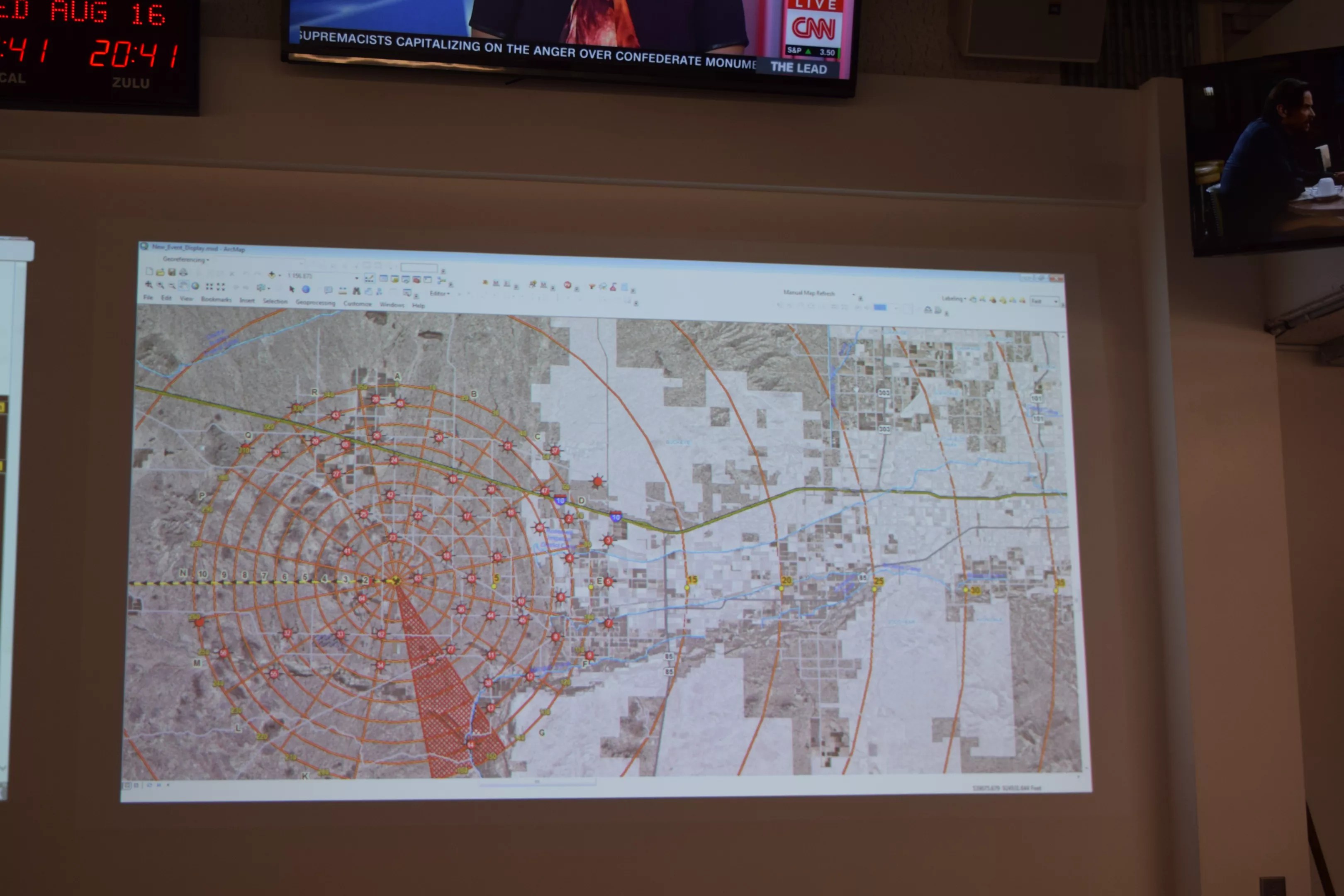 One modern part of the office is the emergency operations center, a two-tiered room with computer, projection screens, and a digital clock with bright-red numbers on the wall. One screen displayed a map of the region, with nearby Palo Verde Nuclear Generating Station represented as a yellow-and-black dot.