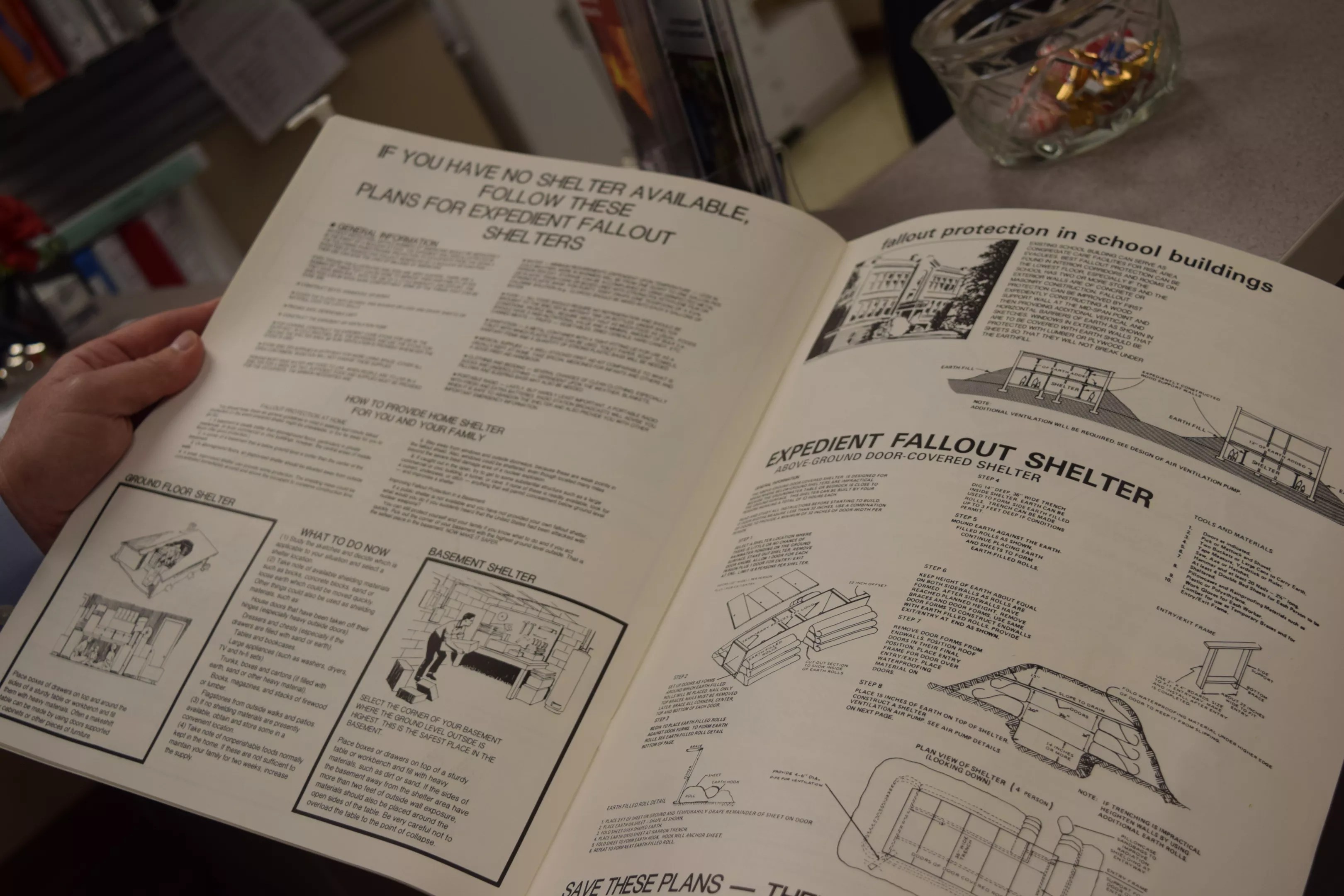 A copy of a Civil Defense booklet that shows how to construct a makeshift shelter, among other atomic bomb survival tips.