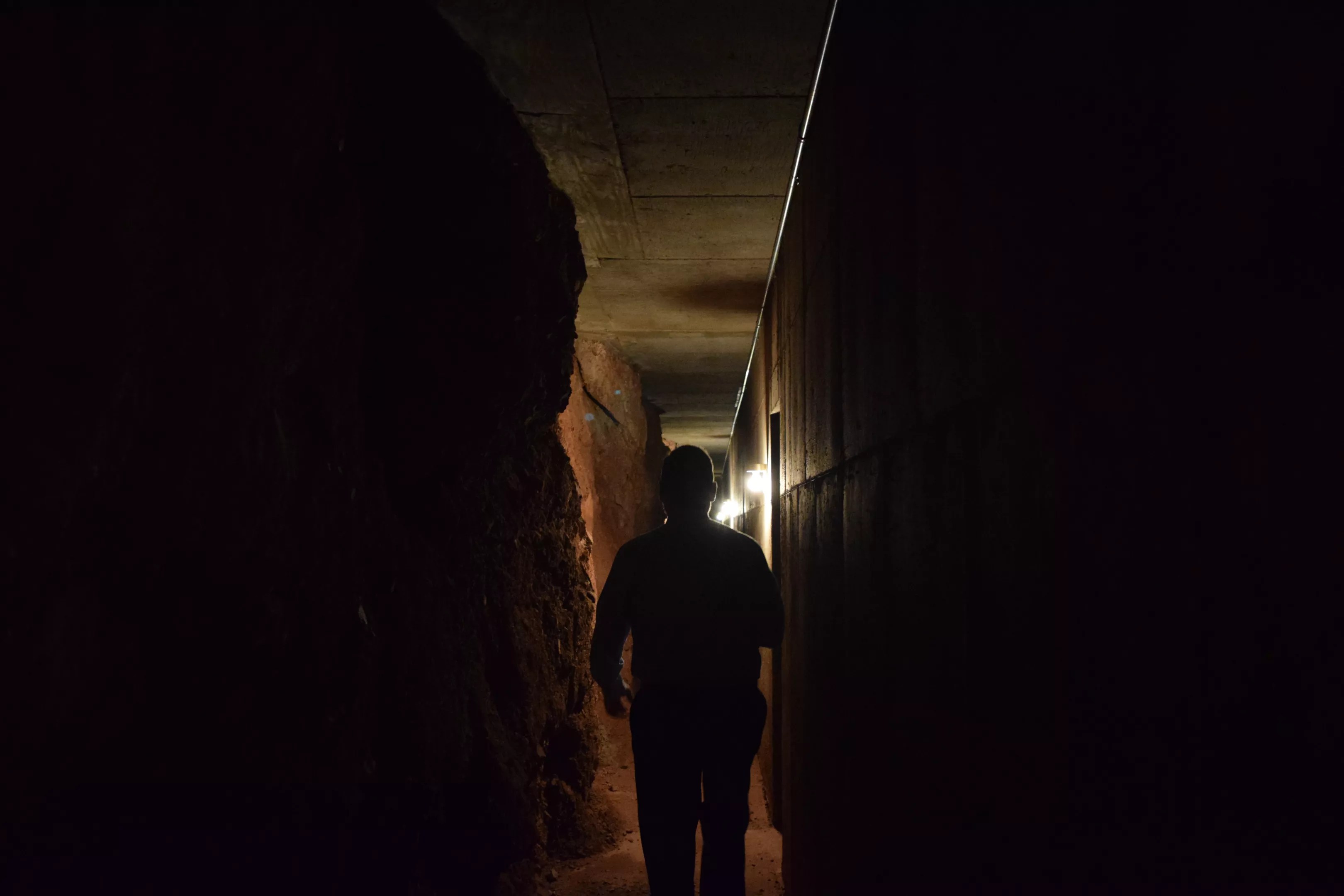 The flight of stairs where I entered the building is not the original entrance to the shelter. For that, Rowley led me through the narrow hallway, passing by what used to be dormitories for the personnel stationed here, until we reached a huge iron door, accessible from the roof at the top of the red-rock hill.