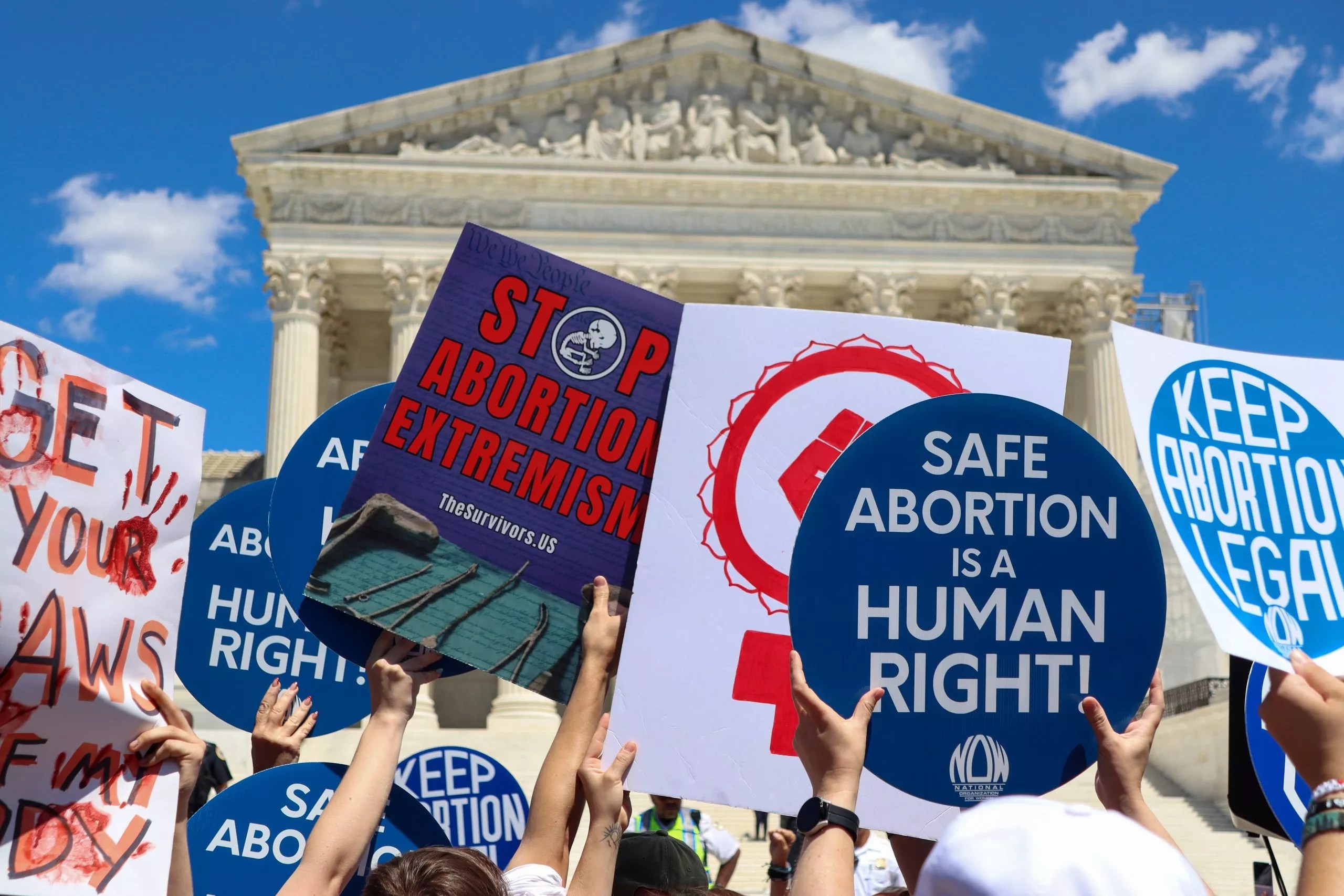 Abortion rights and anti-abortion protesters hold up signs at the Supreme Court in Washington, D.C., on June 24.