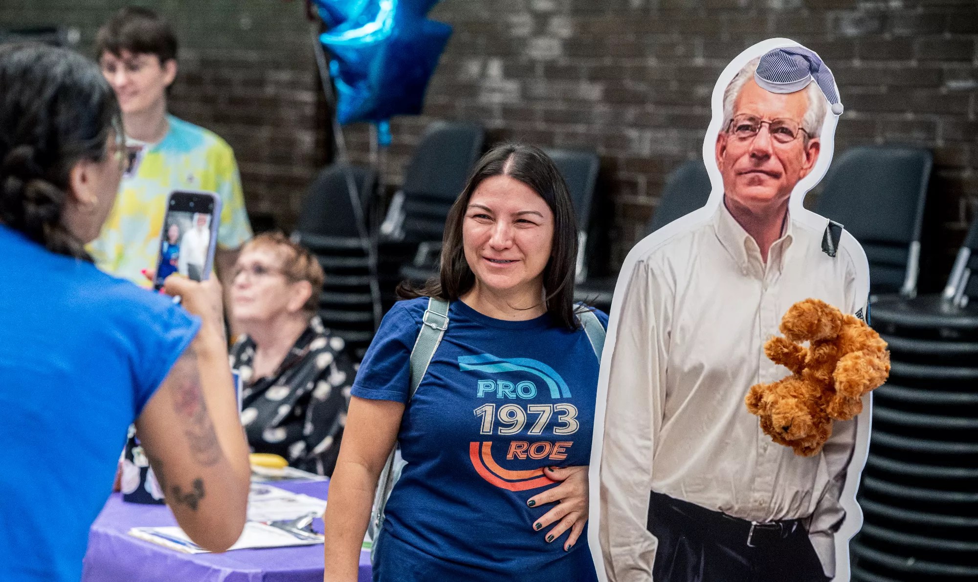 A life-size cardboard cutout of Schweikert, replete with sleeping cap and stuffed toy, poses for a photo-op with Legislative District 1 resident Bianca Sarkisova.