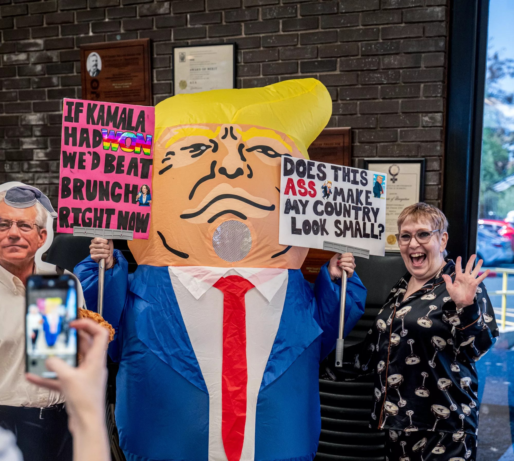 The honored not-quite-guest of the event was Schweikert, whose Scottsdale- and Paradise Valley-based district included the protest’s location. While not there in person, Schweikert was amply represented by postcards, placards, life-size cutouts and even larger portraits of him plastered everywhere and inescapable throughout the building. Most of the images showed him either preparing to slumber or already zonked out. At some point during the morning, an inflatable Trump dropped by for an impromptu visit.