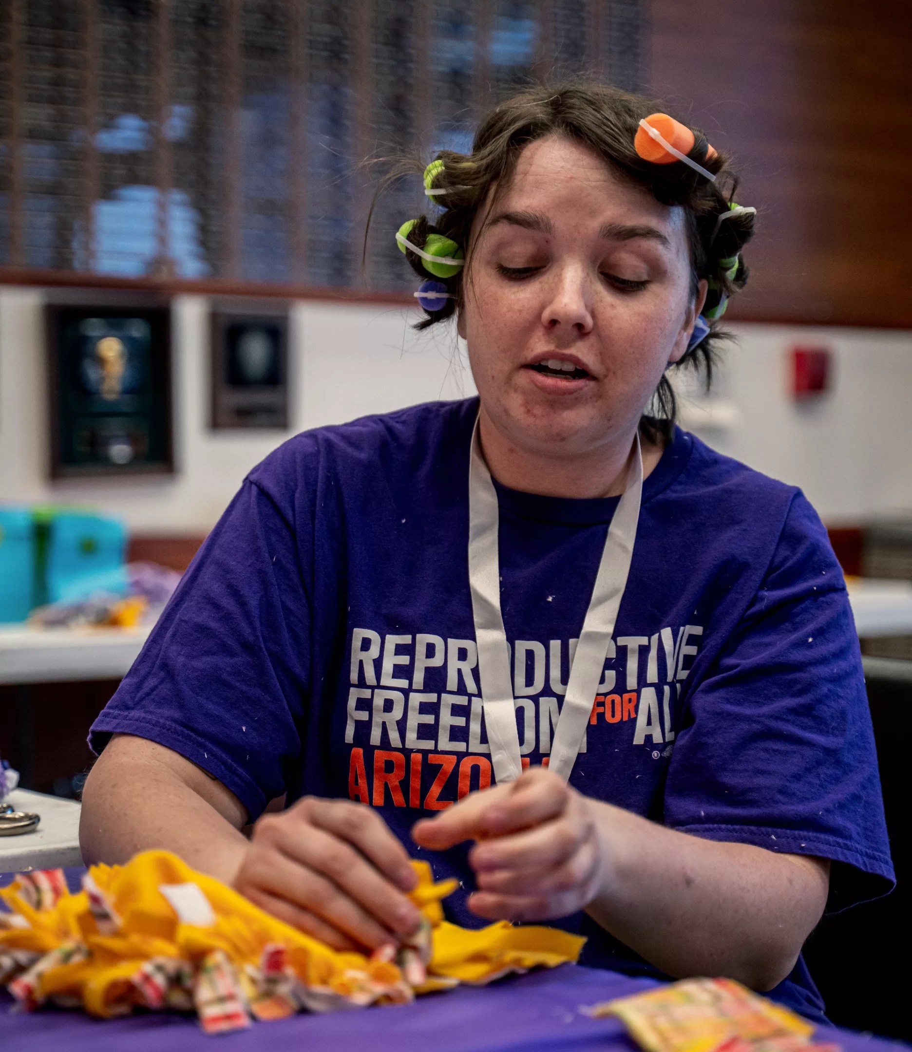 Natasha Voss, a volunteer with Reproductive Freedom for All, makes felt pillows at the children’s activity table. “We want everyone to be able to sleep as soundly as Schweikert does when he’s supposed to be working.”