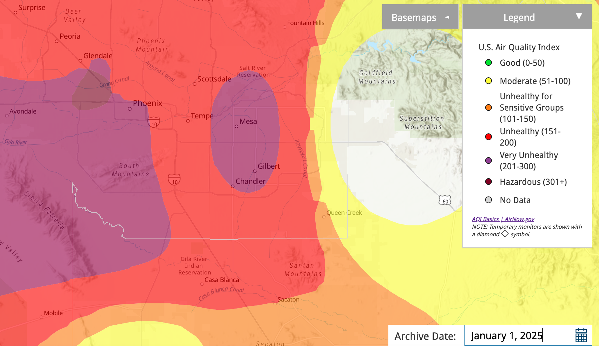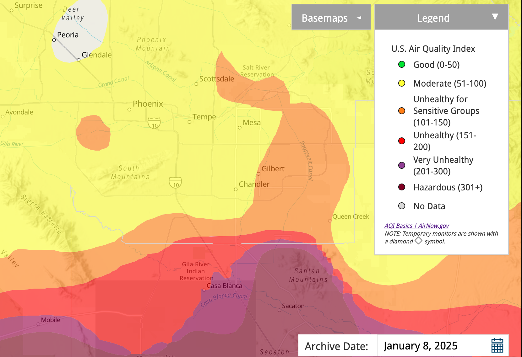For much of the week, Phoenix has been in the moderate category, but parts of the Valley such as the San Tan Mountains saw Very Unhealthy conditions on Wednesday, according to the EPA.