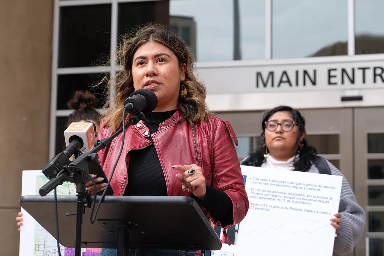 Viri Hernandez, executive director of Poder in Action, during a March 1 event outside Phoenix City Hall.