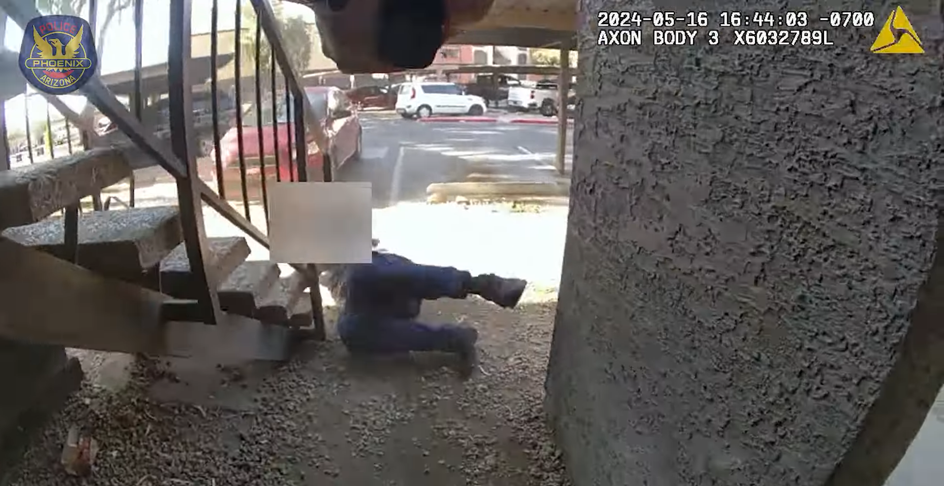 The body of Devin Montgomery, as seen in police body-cam footage that has been partially blurred, after a Phoenix police officer shot him following a chase and alleged shootout on May 16.