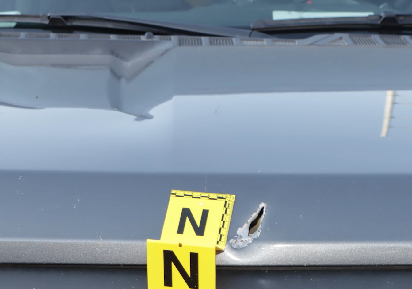 One of several bullet holes in an unmarked police vehicle. Phoenix police said the bullet holes are from a May 16 shootout that resulted in the death of Devin Montgomery.