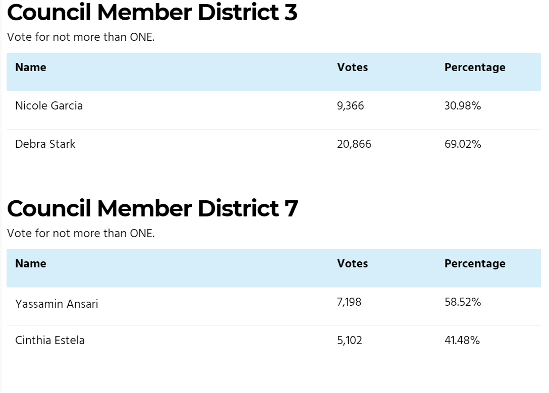 The vote counts released tonight include more than 40,000 citywide mail-in ballots received by last Friday and the couple-hundred cast in-person over the weekend. More results will trickle in as late-returned ballots are added to the total but appeared unlikely to force an upset in either district race.