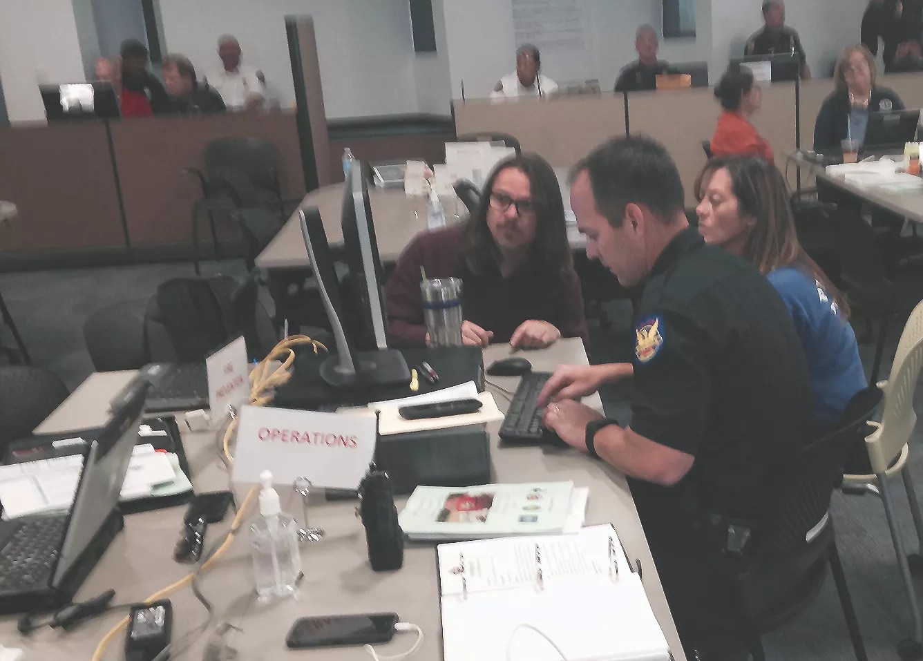 They huddled in teams around tables labeled communications, transportation, aviation, logistics, and public information. Two tables had paper tents that labeled the work “intel.”