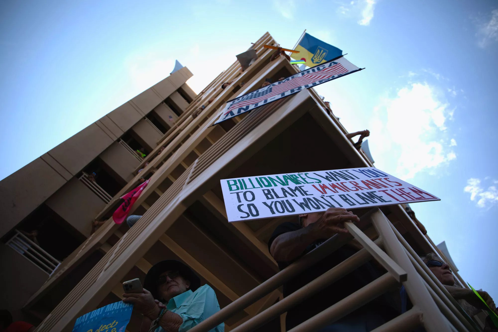 Several protesters carried signs related to the continued imprisonment in El Salvador of Kilmar Abrego Garcia, whom the Trump administration admits it mistakenly deported.