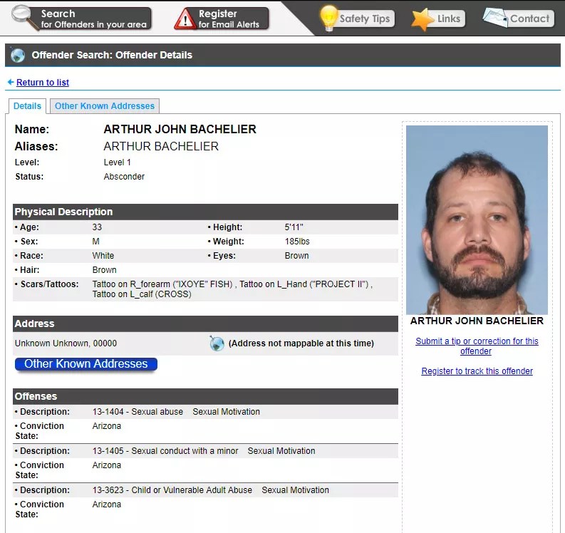 There, more men from the U.S. Marshal’s Service were waiting. Bachelier, a fugitive sex offender who fled charges and a new rape investigation in Phoenix, was arrested at gunpoint.