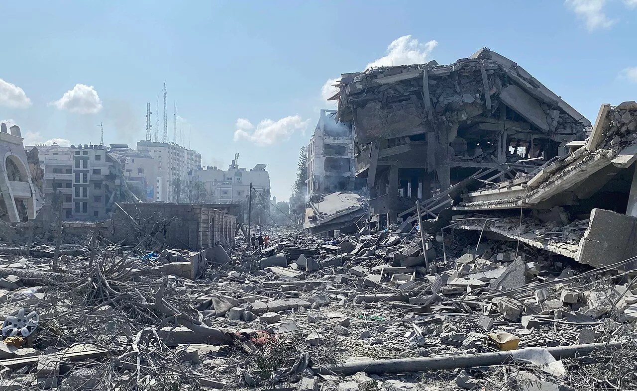 Palestinians inspect the damage following an Israeli airstrike on the El-Remal area in Gaza City on October 9, 2023.