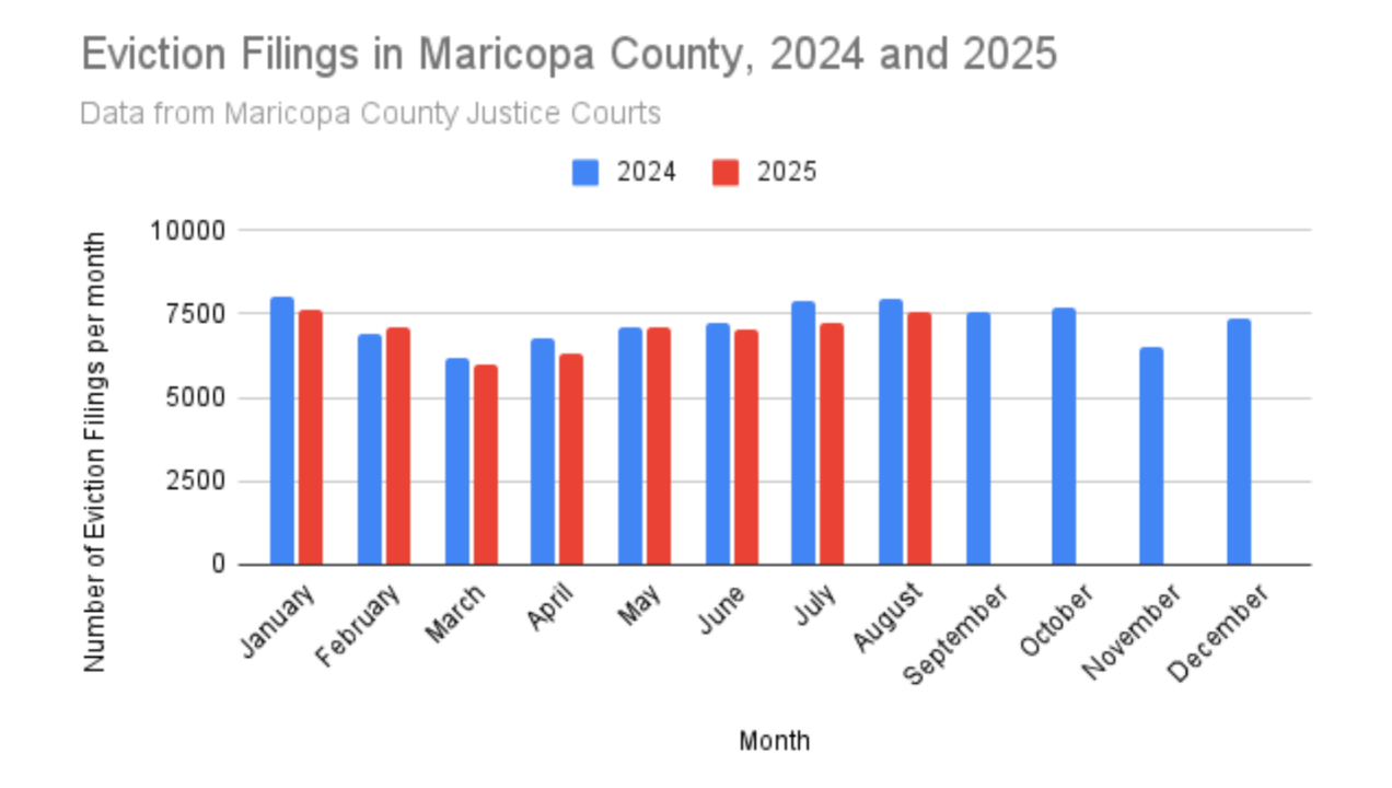 Last year, 87,197 evictions were filed in Maricopa County courts, according to the Maricopa County Justice Courts data. That broke a 2005 record of 84,000 eviction filings. So far this year, the number of eviction filings has tracked relatively close to last year’s rate. Nearly 56,000 evictions have been filed through the end of August and two months – February and May – saw slightly more eviction filings than the same months in 2024, according to Justice Courts data.