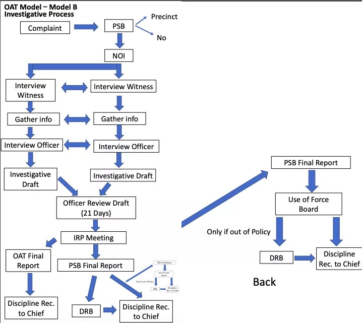 Under Garcia’s model, a new city-staffed agency, the Office of Accountability and Transparency (OAT), would actively monitor and participate in police misconduct investigations. The model would allow an OAT employee to conduct a parallel investigation alongside a police Professional Standards Bureau investigation into officer misconduct. It would also provide independent reports with recommendations on discipline to the chief, though the decision on discipline ultimately would rest with the chief.