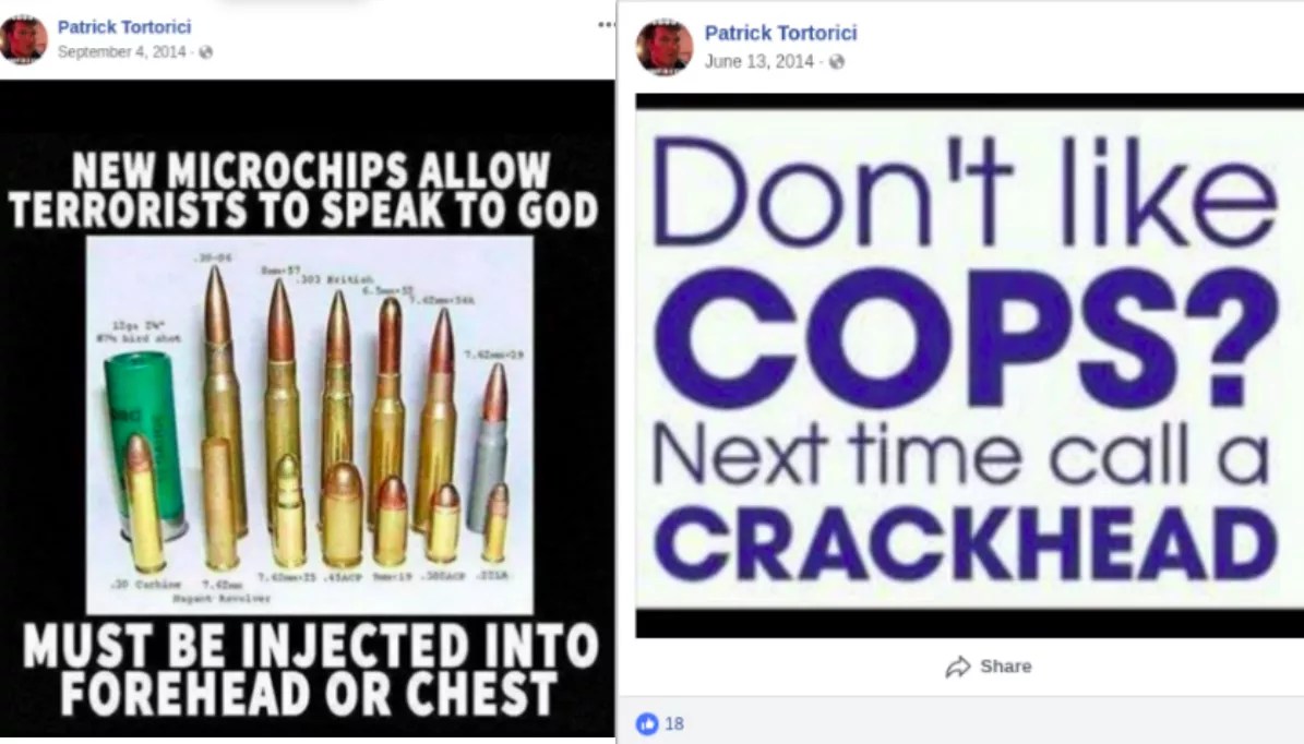 Posts from one Phoenix police lieutenant were also included in the database. Patrick Tortorici shared an image in 2014 captioned, “Don’t like cops? Next time call a crackhead.” He also shared a photo of different types of bullets captioned, “New microchips allow terrorists to speak to God, must be injected into forehead or chest.”