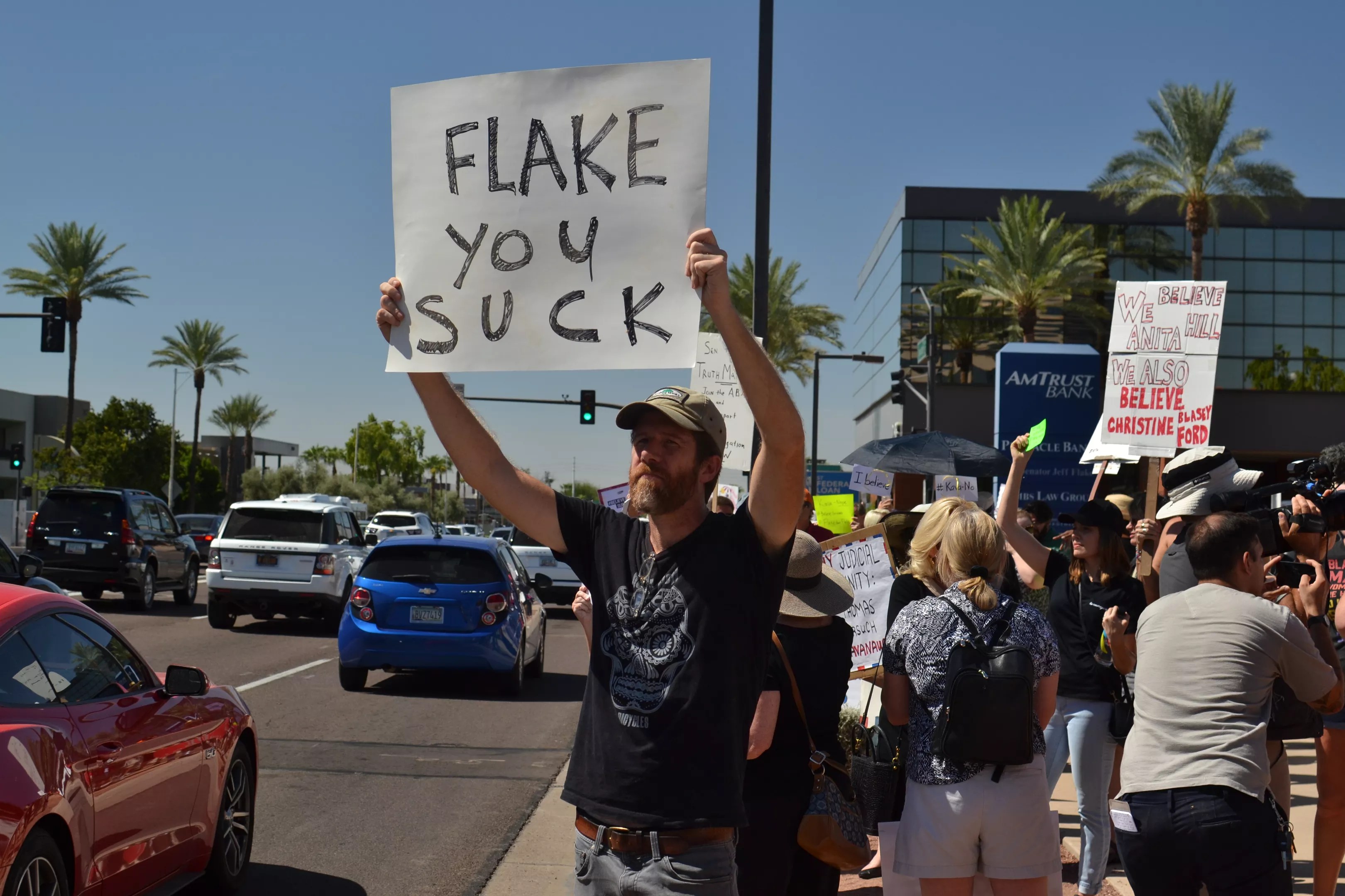 One man lifted a posterboard high over his head. “Flake You Suck” it said in black bubble letters. The man, Chris Hanlon, an associate professor of English at Arizona State University, said he learned about the rally on Twitter and came out because he was sick of the patriarchy and misogyny in the United States.