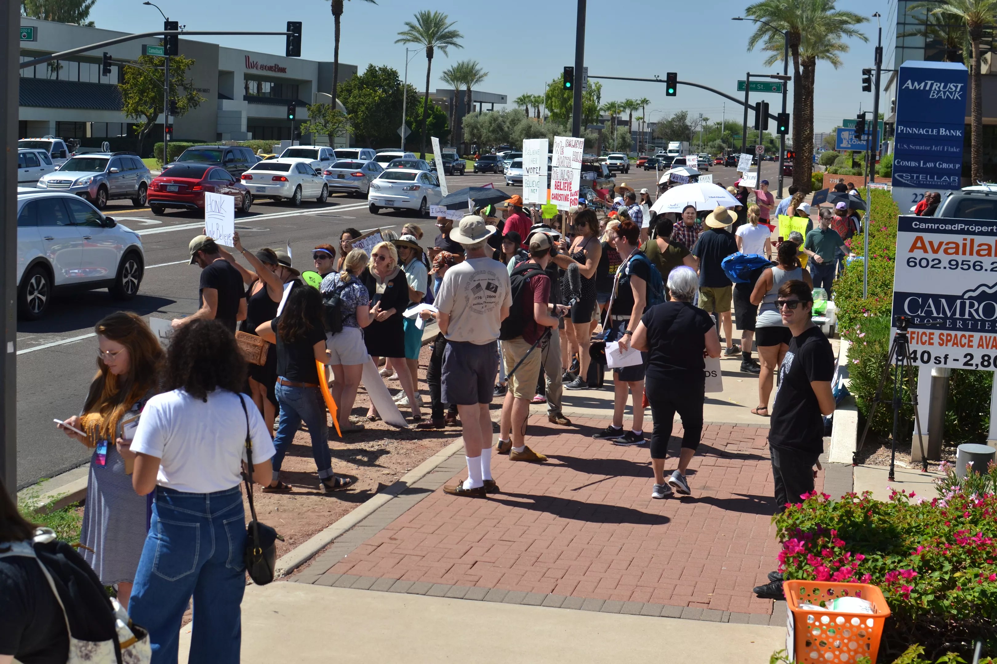 More than 100 people gathered outside the office of Arizona Senator Jeff Flake in Phoenix on Friday afternoon, protesting Flake’s refusal to vote against Supreme Court nominee Brett Kavanaugh and calling for an investigation into Kavanaugh. They also rallied in support of Christine Blasey Ford, who has accused Kavanaugh of sexually assaulting her when they were in high school.