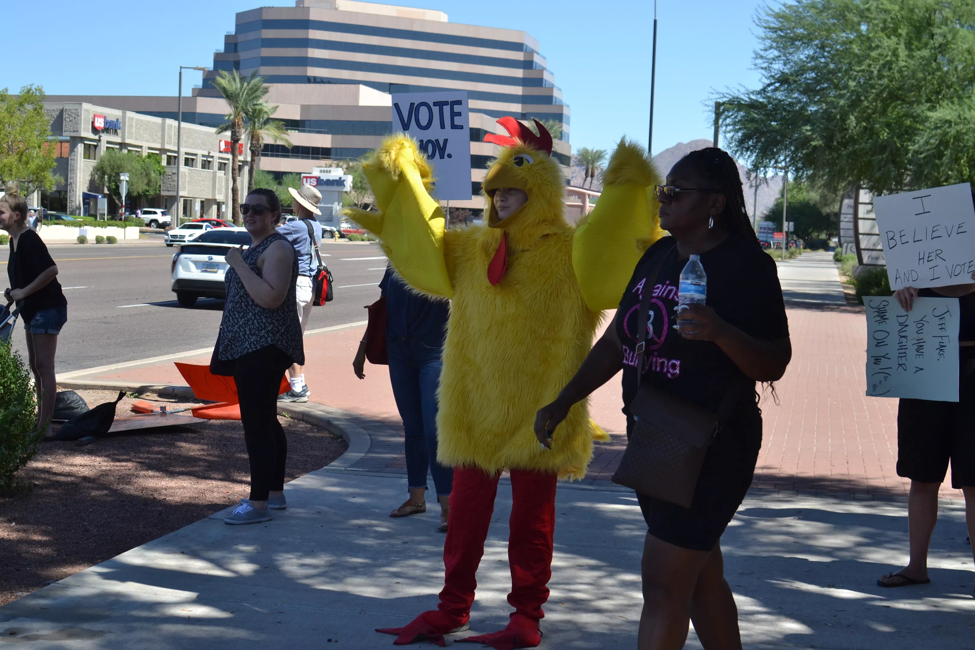 The rally brought also out Clucky the Flaky Chicken, a.k.a. Melody Steele. Steele, who is 17, said Clucky hadn’t made a public appearance since the Trump rally in Phoenix in August 2017.