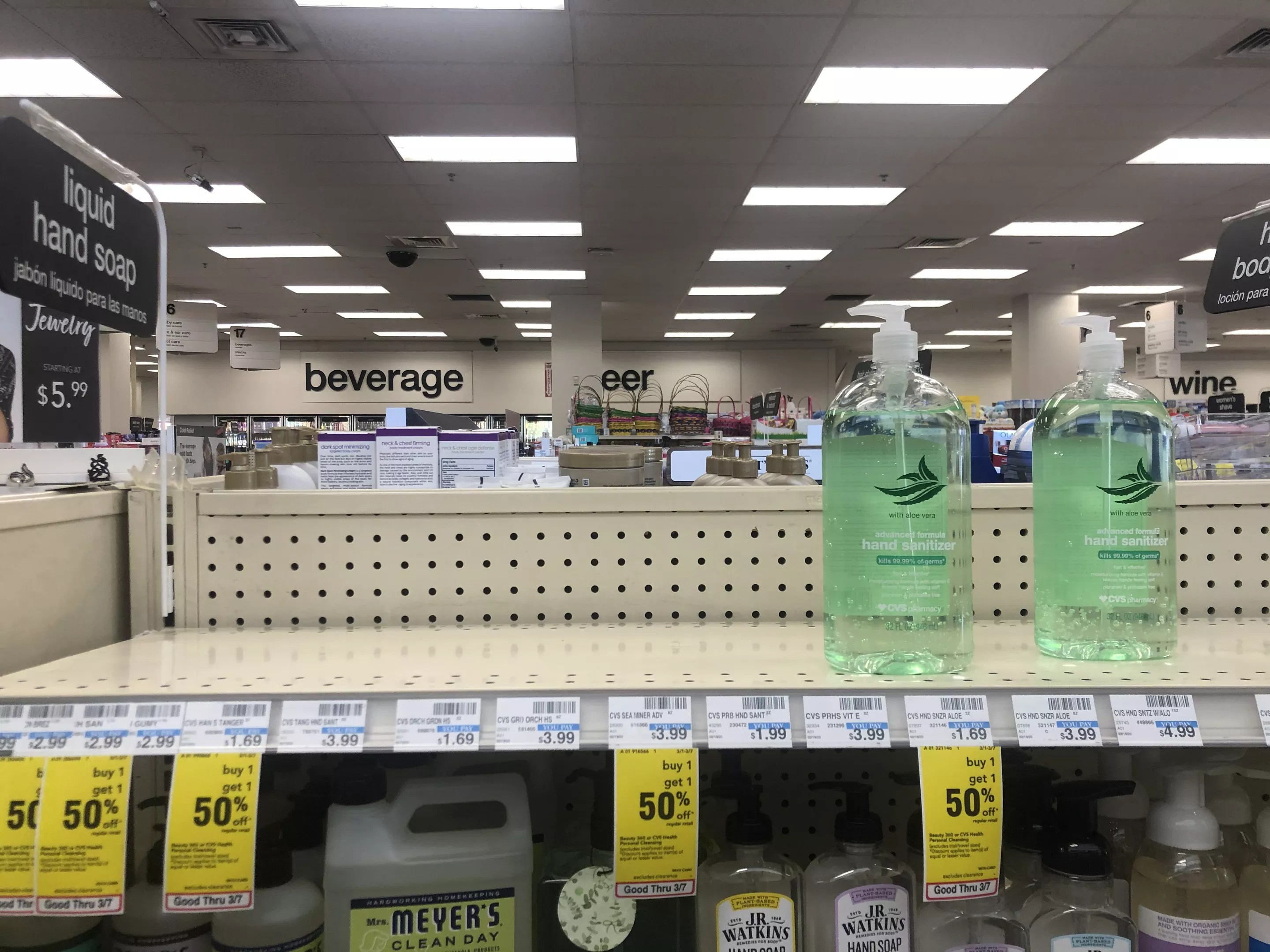 Two bottles of hand sanitizer were all that remained Tuesday after a brand-new shipment at the CVS on First and Jefferson streets.