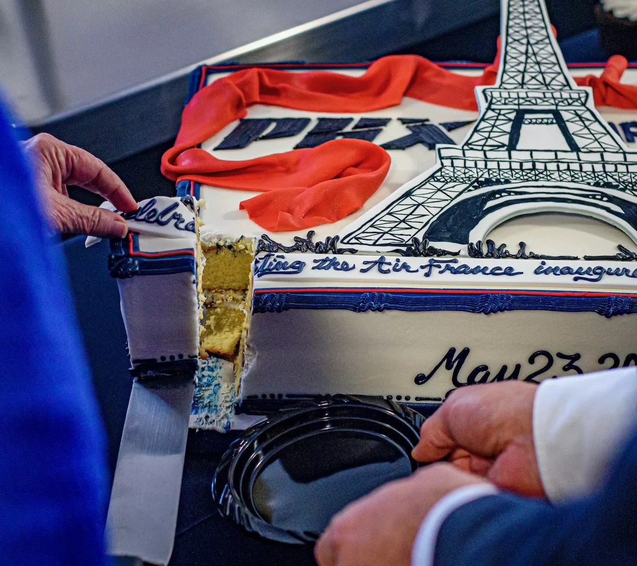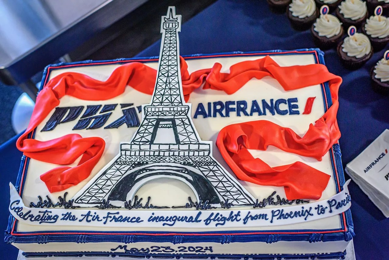 A custom cake celebrates the announcement of nonstop flights between Charles de Gaulle International Airport in Paris and Phoenix Sky Harbor International Airport.