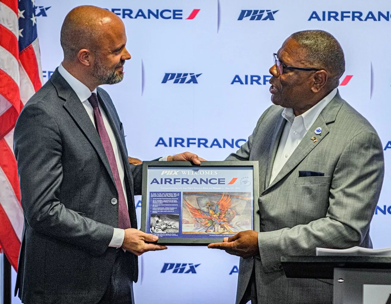 Phoenix District 6 Councilmember Kevin Robinson presents a representative from Air France with a plaque that commemorates the inaugural nonstop flight between Charles de Gaulle International Airport in Paris and Phoenix Sky Harbor International Airport.