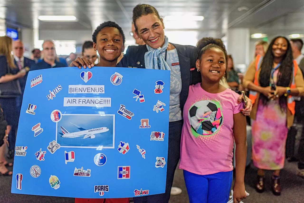 Two children hold a sign while posing with an Air France flight attendant to celebrate the arrival of nonstop flights between Charles de Gaulle International Airport in Paris and Phoenix Sky Harbor International Airport.