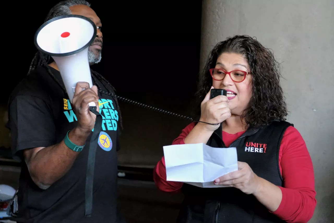 “Whose airport?” “Our airport!” The chants echoed from a small gathering of airport service workers and organizers with the Service Employees International Union outside Terminal 4.