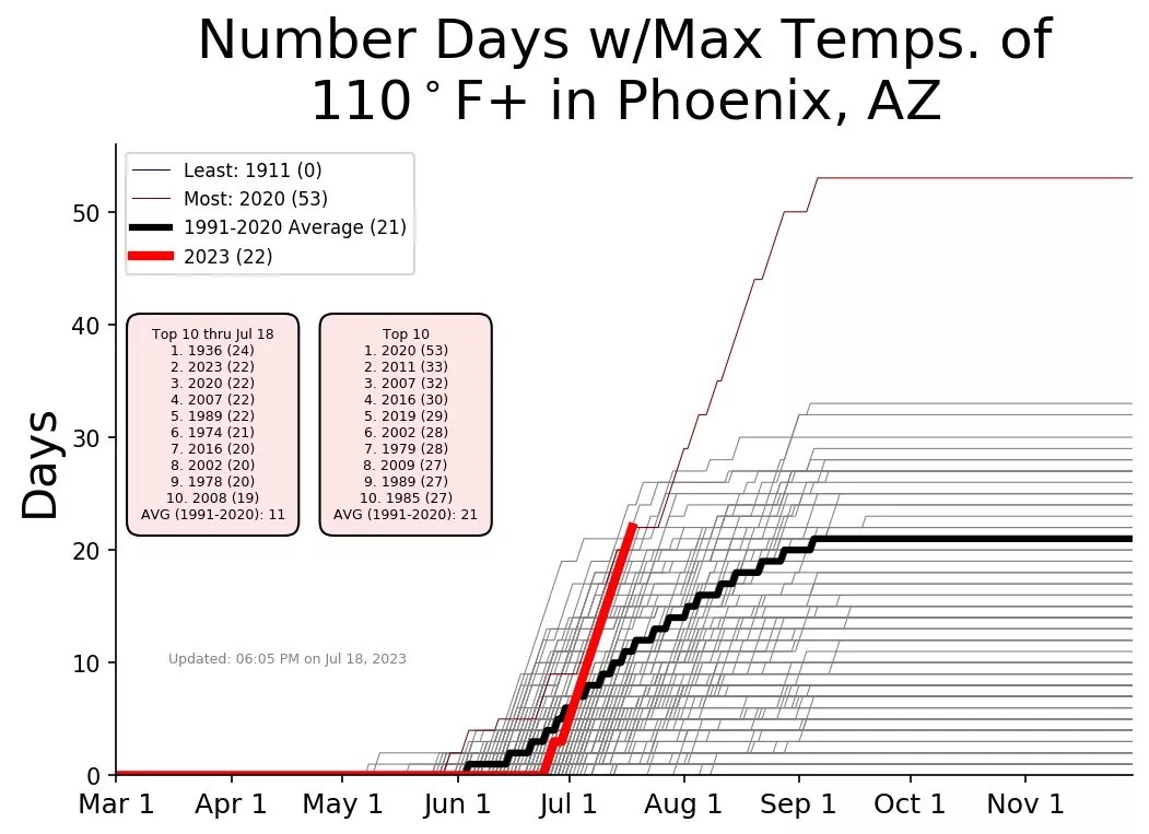 Every single day so far in the month of July, the high temperature – as recorded by the National Weather Service at Phoenix Sky Harbor International Airport – has been 110 degrees Fahrenheit or higher.