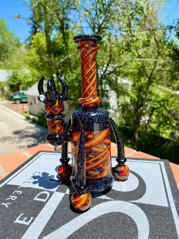 “I used Illuminati glass on that,” he says. “It’s sold out right now, so I put that design on pause.” The popular green-colored glass, which makes up most of the Abduction rig, is running short in the Valley’s supply chain. The green glass is used to make the spaceship and its alien pilot who’s throwing up a peace sign. The floating cow is not actually floating. Desi cleverly affixed its tail to the glass but purposely added an udder detail to distract the weed or concentrate oil consumer. Its entirety is encapsulated in a more oversized glass which acts as the rig’s frame and chamber.