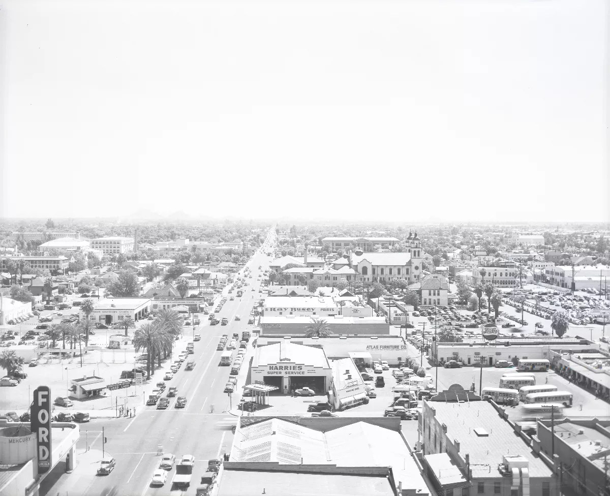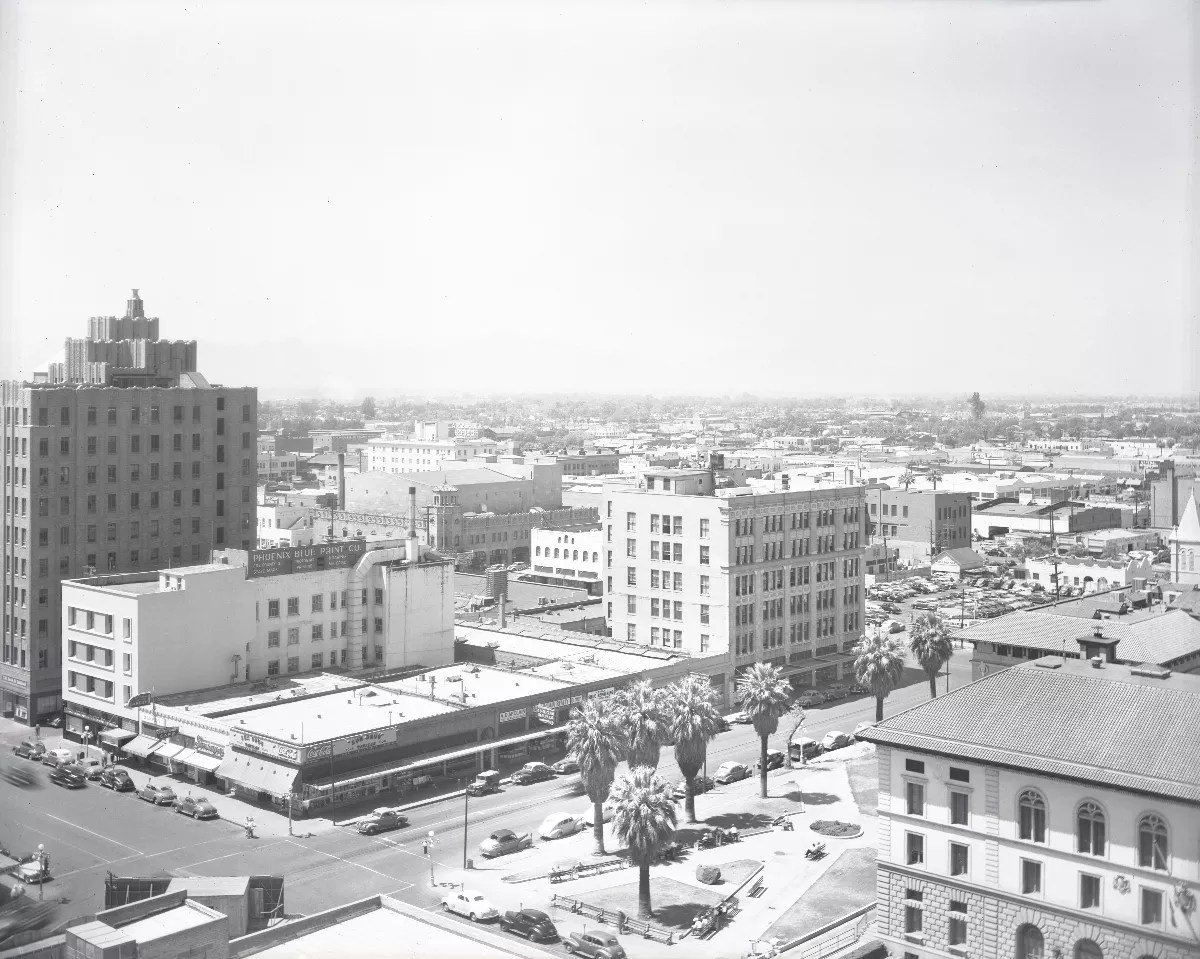 This photo was taken sometime around 1950, and look how the city has expanded. Many older buildings can be found – St. Mary’s Basilica, the Title and Trust Building, Luhrs Tower. But this wider view also gives us a glimpse of the Westward Ho building on the far left of the frame. Phoenix in 1950. Arizona State Archives
