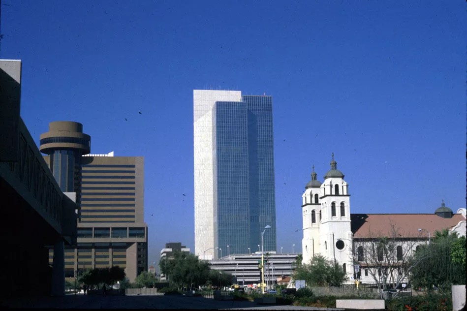 In this 1973 photo, you can see the Valley National Bank building – now with rotating sign – next to a brand-new glass facade tower constructed the year before. Initially owned by Valley National Bank, the structure was renamed Chase Tower – as we know it today – following a series of corporate takeovers and mergers.