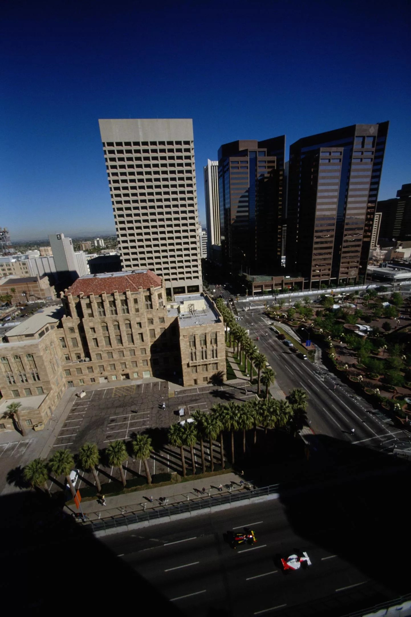 This 1991 photo was taken during practice for the Iceberg United States Grand Prix. That’s Ayrton Senna and Aguri Suzuki zipping by the old courthouse, with One and Two Renaissance Square – completed in 1986 and 1990, respectively – and 100 West Washington in the background. To the right of the old courthouse is Patriot Square Park, which has since been replaced by CityScape.
