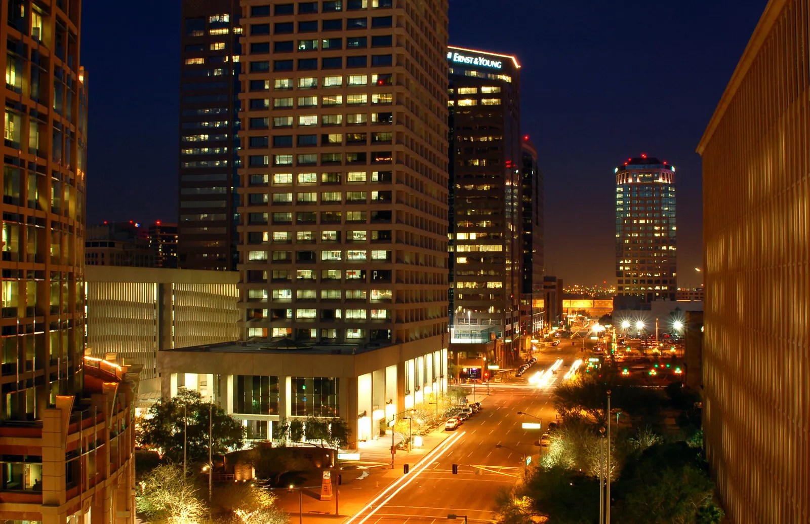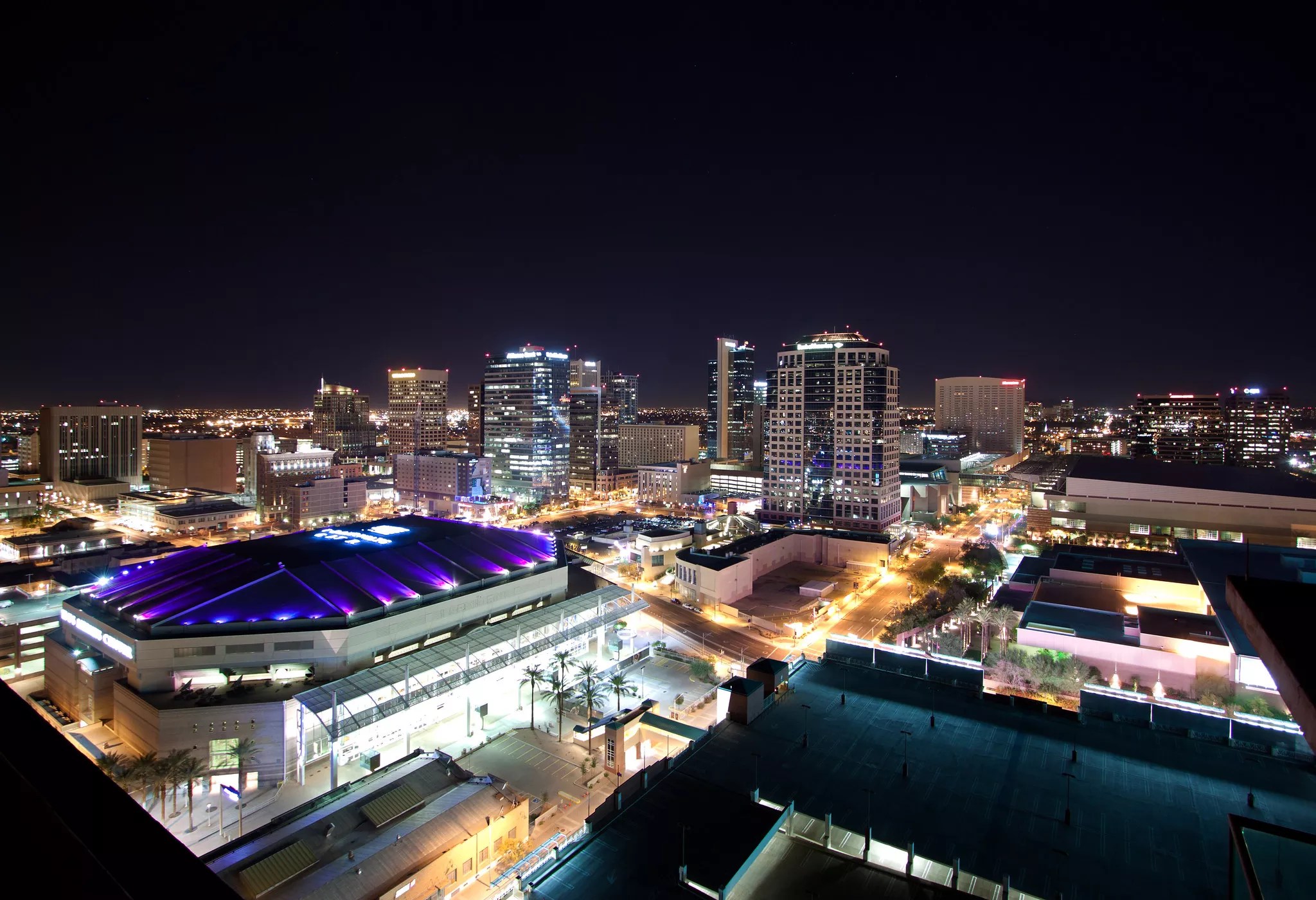 A fuller view of the then-US Airways Center, taken in 2012. Bank of America Tower, completed in 2000, sits a block north.