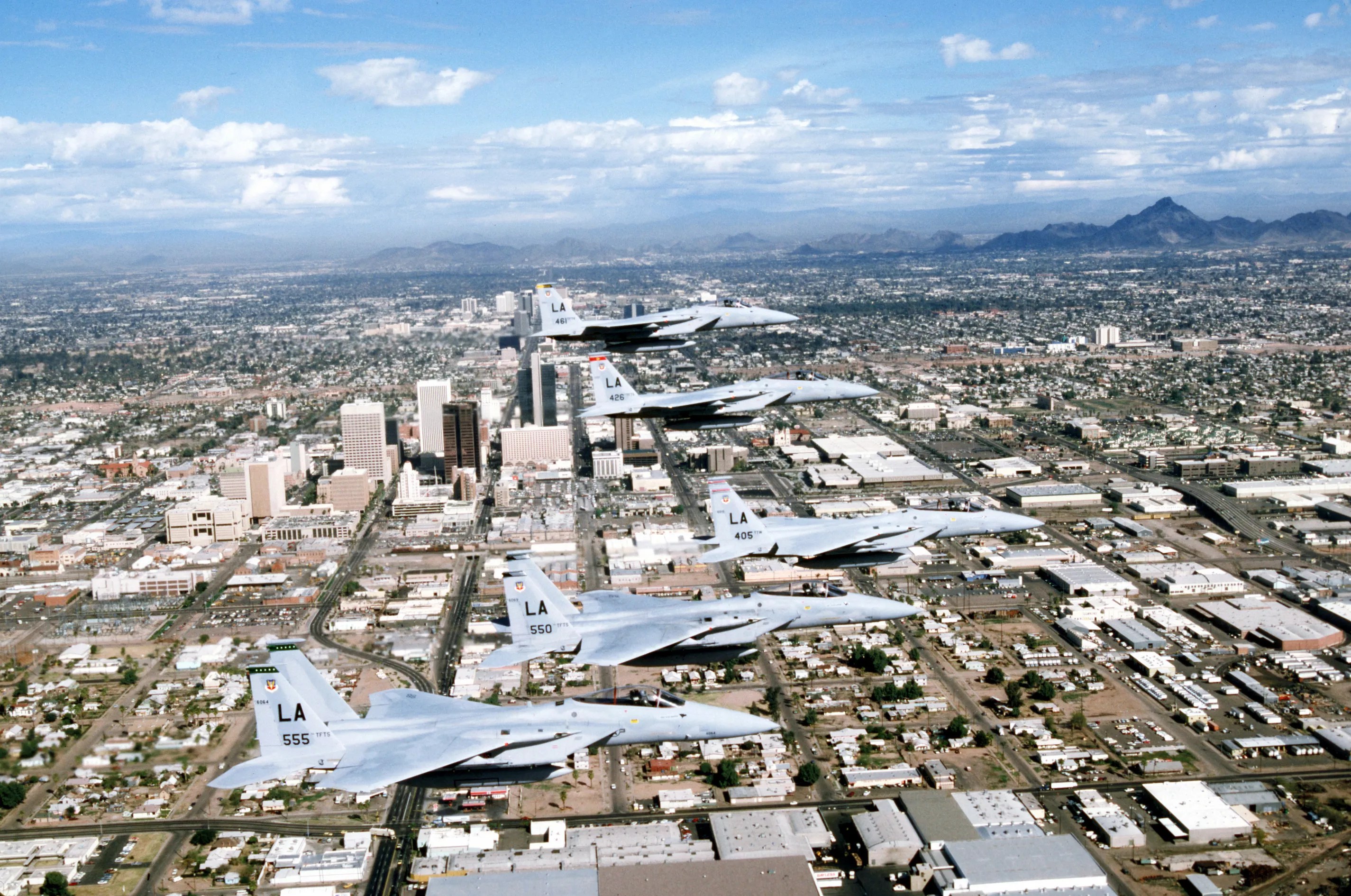 In 1987, five F-15 Eagle fighters fly over downtown Phoenix. See those nondescript buildings right next to where Seventh Street leaps over the railroad tracks? A decade later, they’d be replaced by Chase Field.