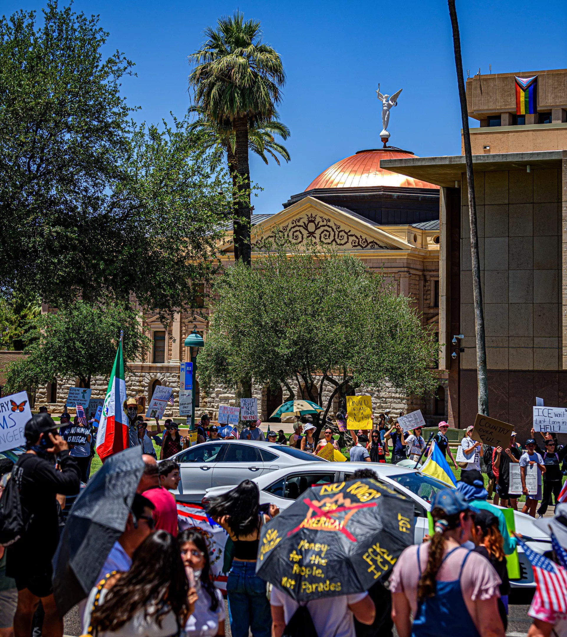 The protest outside the Capitol was unlike any show of dissatisfaction in recent memory – a swarm of people spanning as far as the eye can see, carrying signs ranging from the philosophical to the crude to the very random. The atmosphere was lively but contained, dimmed by weather that reached 100 degrees by noon. Crowds of people also protested at several other sites in the Valley and in the state, but the Capitol gathering was by far the largest.