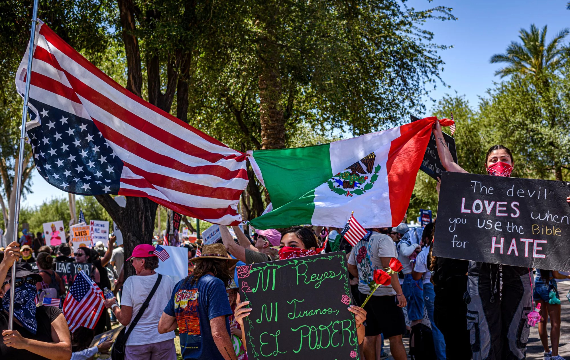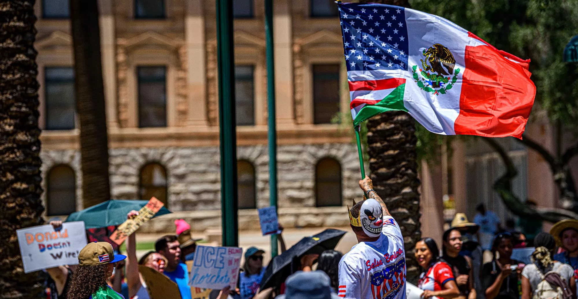 With immigration agents terrorizing Latino neighborhoods, many protesters carried Mexican flags.