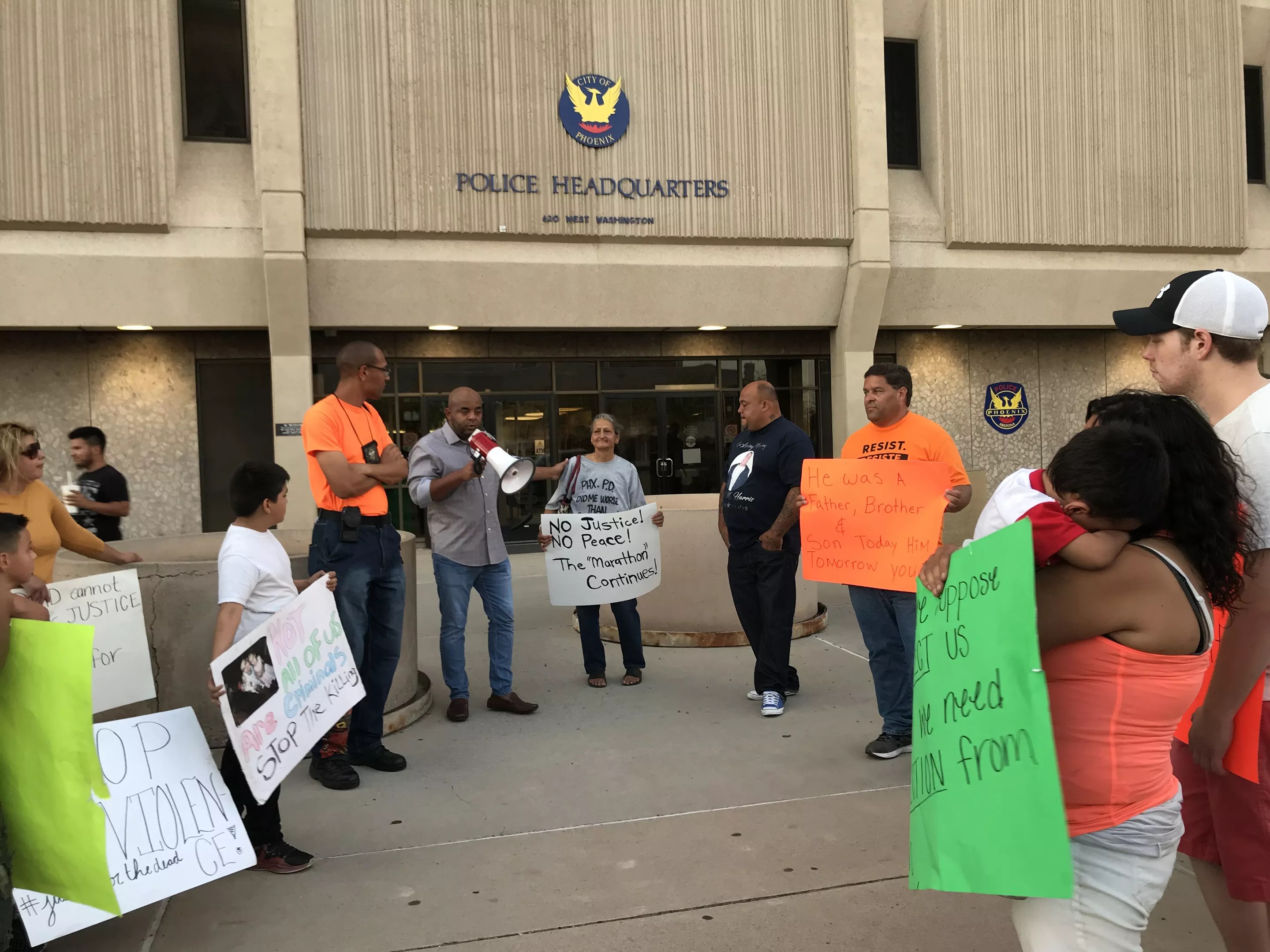 Protesters outside Phoenix police headquarters.