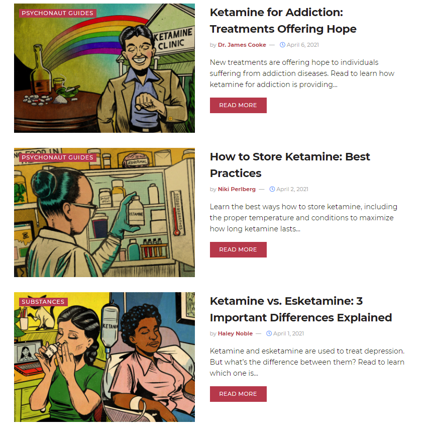 Stang draws a distinction between the company’s medical side and its psychedelic lifestyle brands. However, it’s not so neat. Of the 14 articles on the front page of Reality Sandwich last week, 11 were specifically about ketamine, with five of those focused on ketamine treatment. A company press release advertising the purchase of the ketamine clinics said that they hope to drive users of Delic-owned websites to their clinics. And when asked where interested potential patients should start, Stang also points to the website.