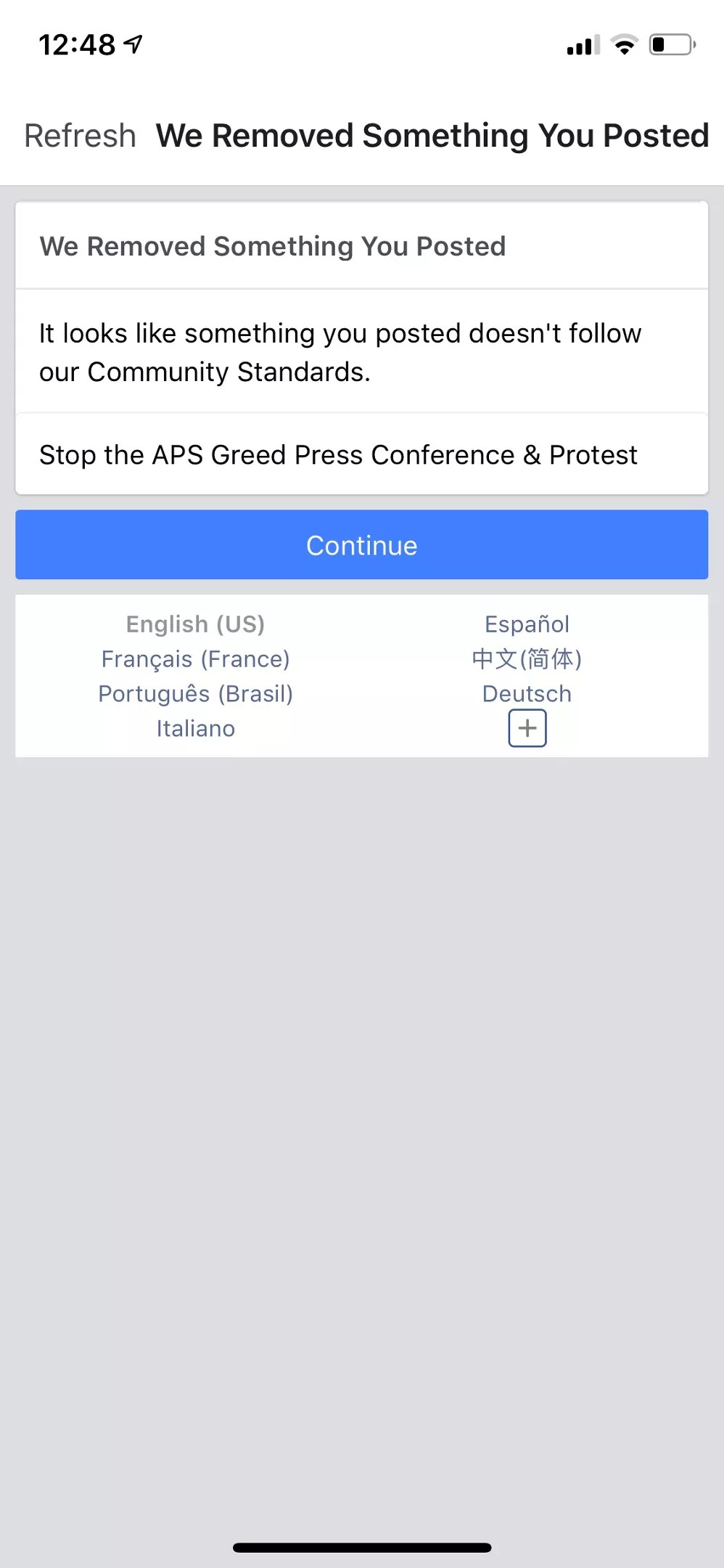 In the hours leading up to the protest, Champion was blocked from Facebook for “bullying and harassment.” Screenshots she shared with Phoenix New Times show that Facebook cited her event, “Stop the APS Greed Press Conference & Protest,” as not following its community standards.