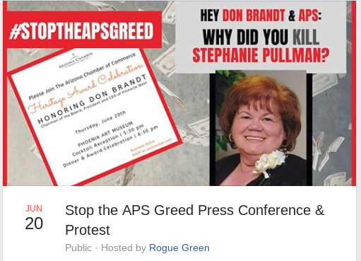 As temperatures hovered around 103 degrees, the group of about 25 people shouted for Arizona Public Service and Brandt to address the death of Stephanie Pullman, a 72-year-old woman who died partly from environmental heat exposure last September after APS cut her power. Brandt received the Heritage Award for his “accomplishments and commitment to Arizona” precisely one week after news of Pullman’s death emerged.