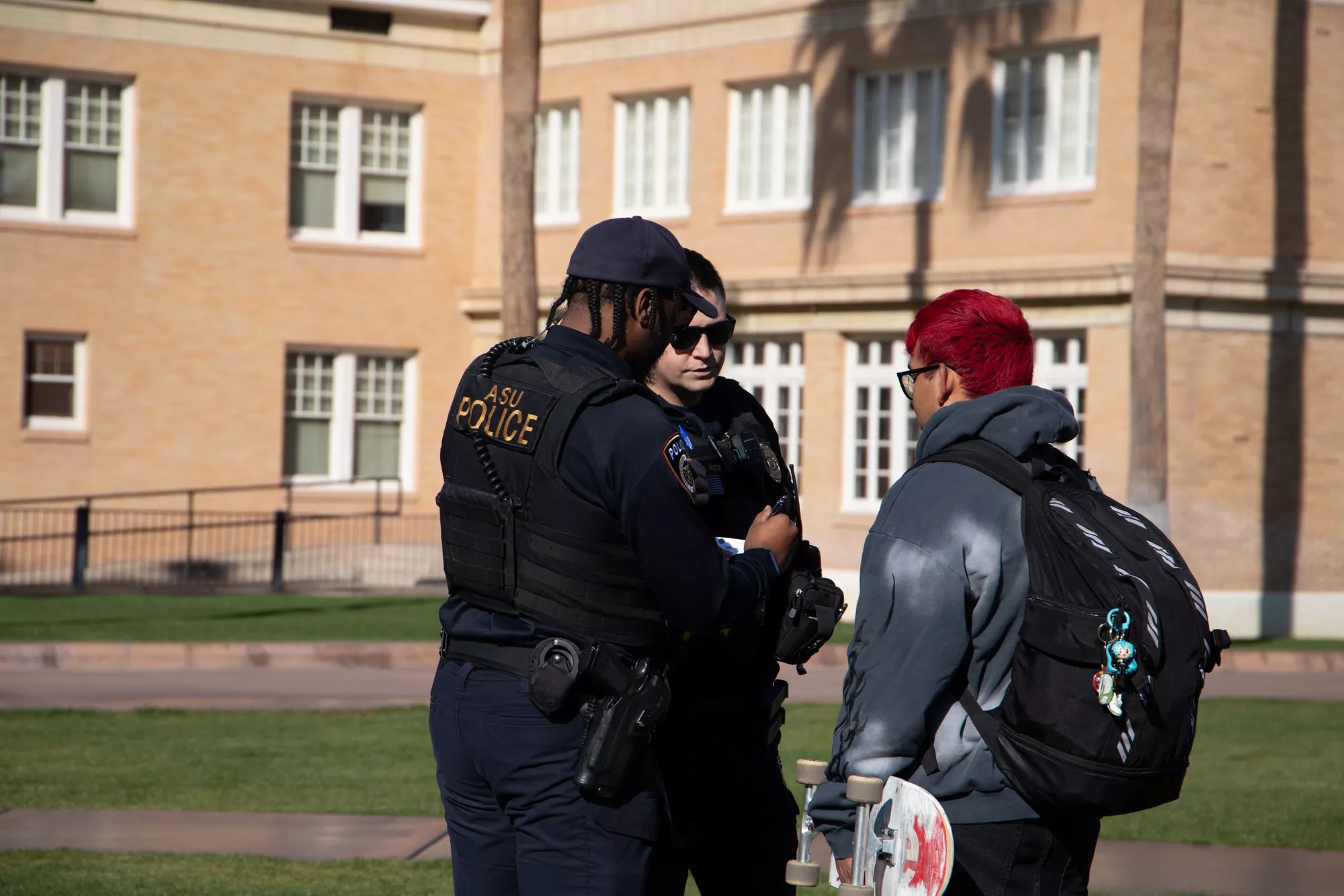 One protester wearing a mask and holding a can of beans skyward in his fist was reprimanded by ASU police for making at least one other student feel threatened. Another student flipped over the CRU table, earning a ticket from police. The table remained on the ground for about an hour, until the four CRU members left as protesters heckled them.