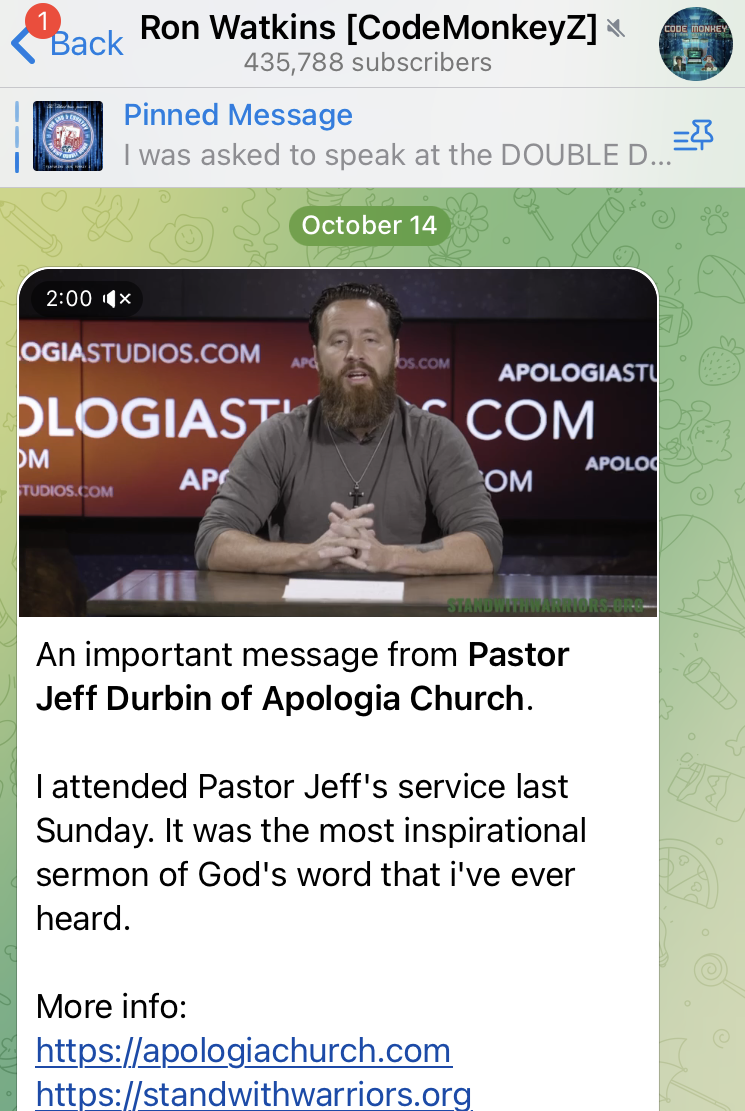 It seems that Watkins discovered Apologia Church, which Durbin says is Reformed Baptist, here in Arizona. For years, Watkins, an American, was living abroad – in the Philippines, and then Japan. But he has been hanging around Phoenix for the past several weeks, meeting with Kari Lake and petitioning, in vain, for a meeting with Attorney General Mark Brnovich, who so far has snubbed him.