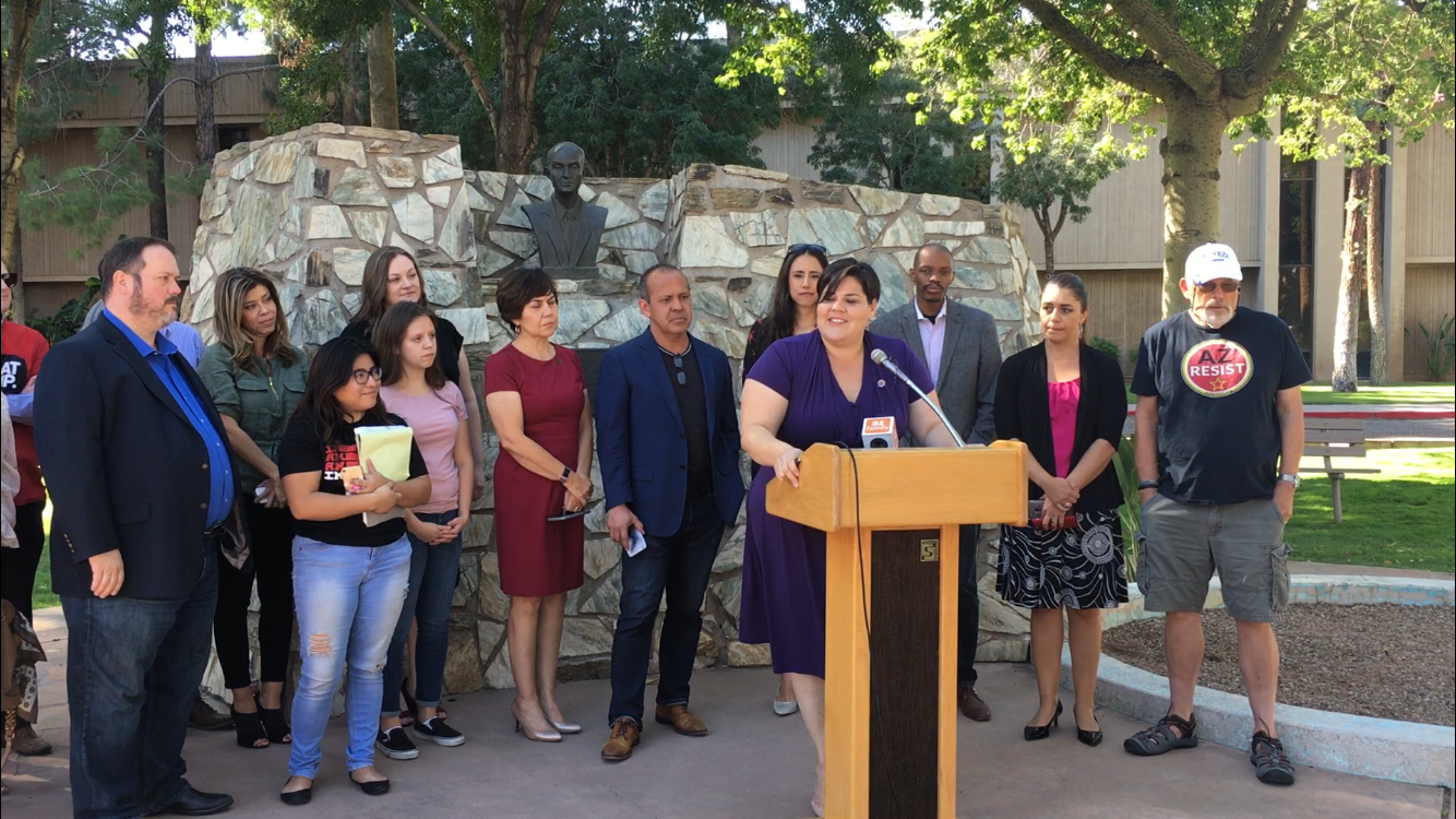 Flanked by about a dozen supporters, including Democratic State Representative Athena Salman and State Representative-elect Robert Meza, she gave remarks in both English and Spanish.