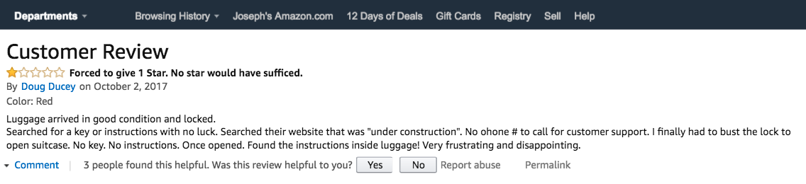 “Luggage arrived in good condition and locked,” the author writes. “Searched for a key or instructions with no luck. Searched their website that was “under construction”. No ohone [sic] # to call for customer support. I finally had to bust the lock to open suitcase. No key. No instructions. Once opened. Found the instructions inside luggage! Very frustrating and disappointing.”