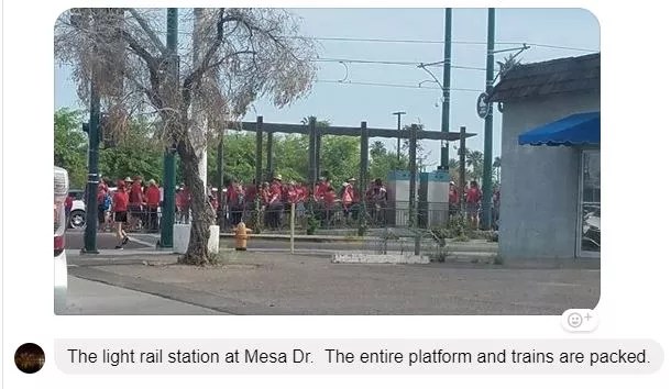 9:11 – New Times reader Matt Hamilton submits photo of light-rail station packed with red shirts