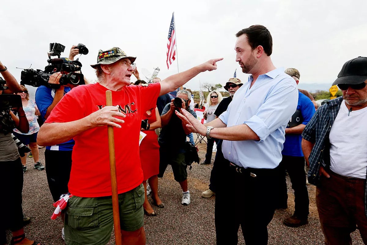 Adam Kwasman, then a state representative and GOP candidate for the U.S. House, has a heated discussion with an anti-immigration activist during a 2014 protest in Oracle.