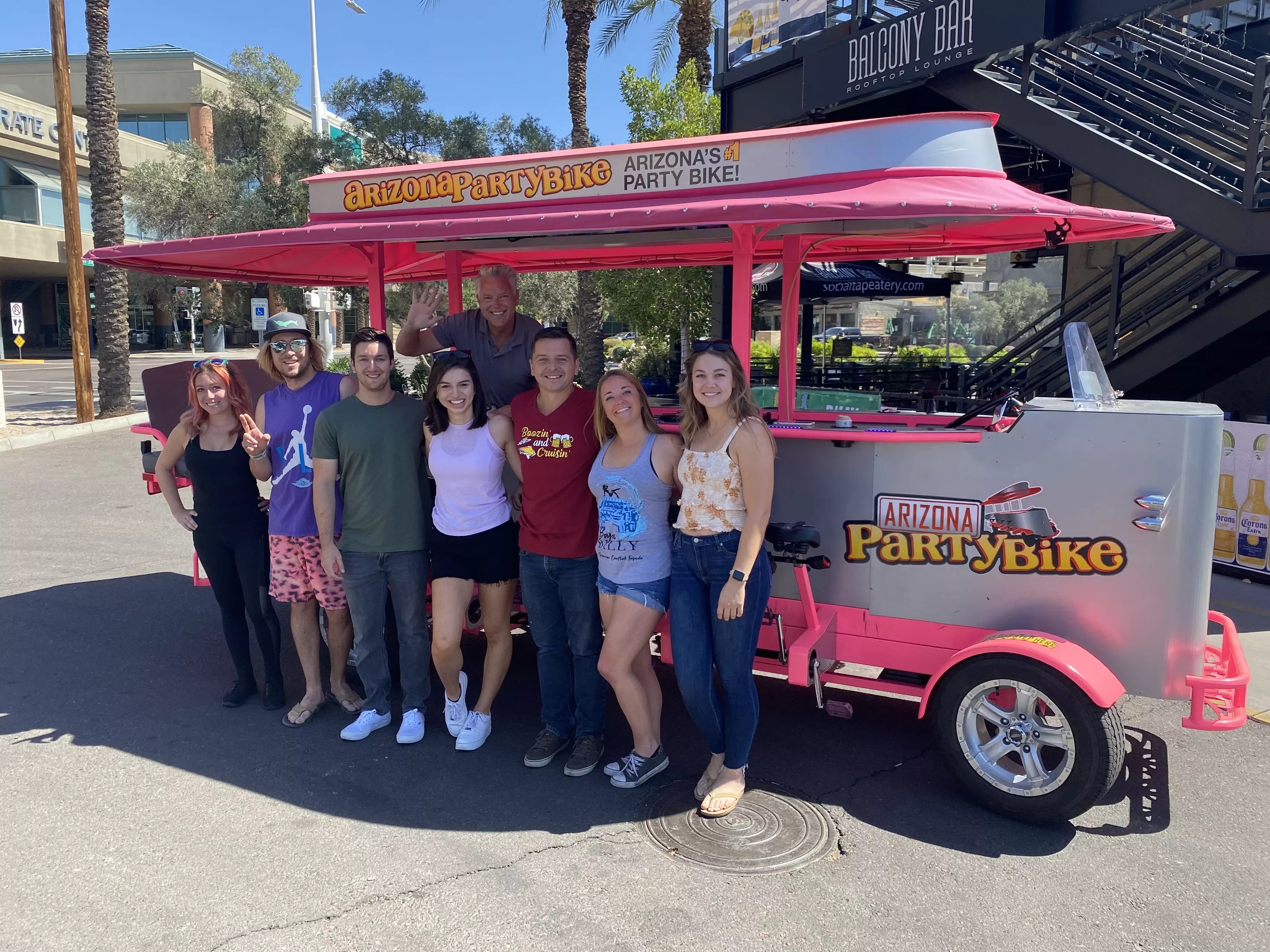 Arizona Party Bike patrons pose in front of the vehicle. Founder Robert Mayer created legislation and successfully lobbied to allow his company to operate by reclassifying party bikes as motor vehicles.